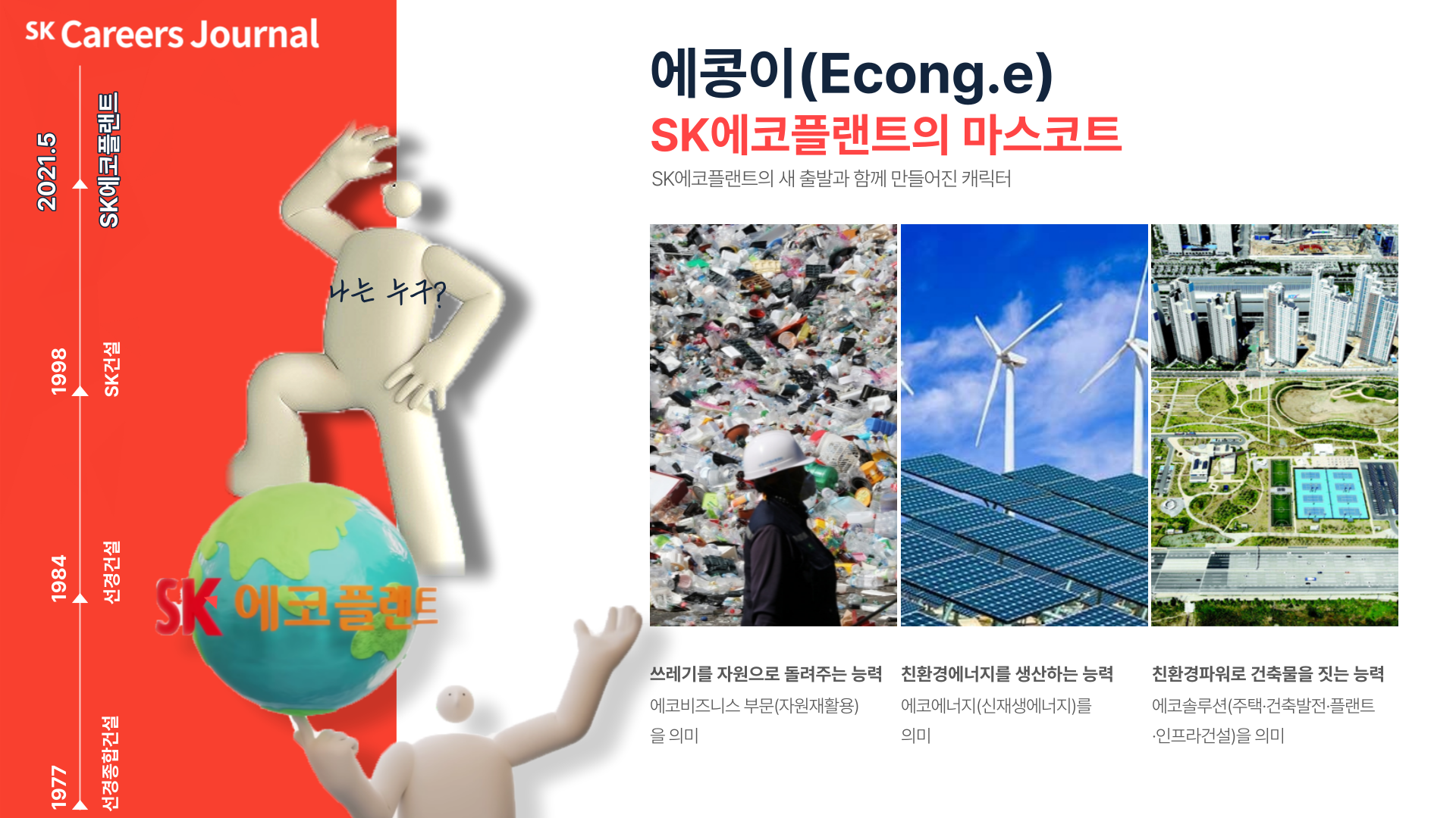 나에게 주어졌던 첫 임무는 사람들에게 SK건설에서 SK에코플랜트로 바뀐 사명과 개편된 사업부문에 대한 이해도를 높여주는 것이 였어. 나는 ‘쓰레기를 자원으로 돌려주는 능력’과 ‘태양과 풍력으로 친환경에너지를 생산하는 능력’, ‘친환경파워로 건축물을 짓는 능력’ 등을 지니고 있어. 이것은 SK에코플랜트가 사명 변경과 함께 확대·개편한 사업부문의 영역과 일맥상통한다 볼 수 있지. ‘쓰레기를 자원으로 돌려주는 능력’은 에코비즈니스 부문(자원재활용)을 의미해.다른 사업부문인 에코에너지(신재생에너지)와 에코솔루션(주택·건축발전·플랜트·인프라건설)도 마찬가지야.