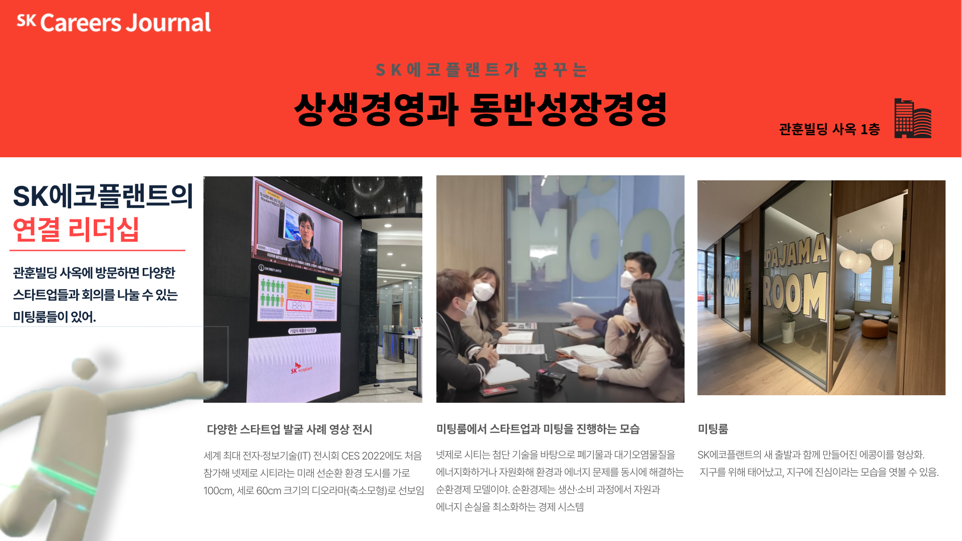 어때? SK에코플랜트 구성원들의 진정성있는 행동에서 시작해서 이처럼 유망한 스타트업을 발굴하고 이들과 상생하고 연결돼서 사회에 선한 IMPACT를 보이려는 SK에코플랜트의 핵심가치가 느껴지니? 사옥 곳곳에서 뿐만 아니라 SK에코플랜트의 행보에서도 이를 확인할 수 있어.