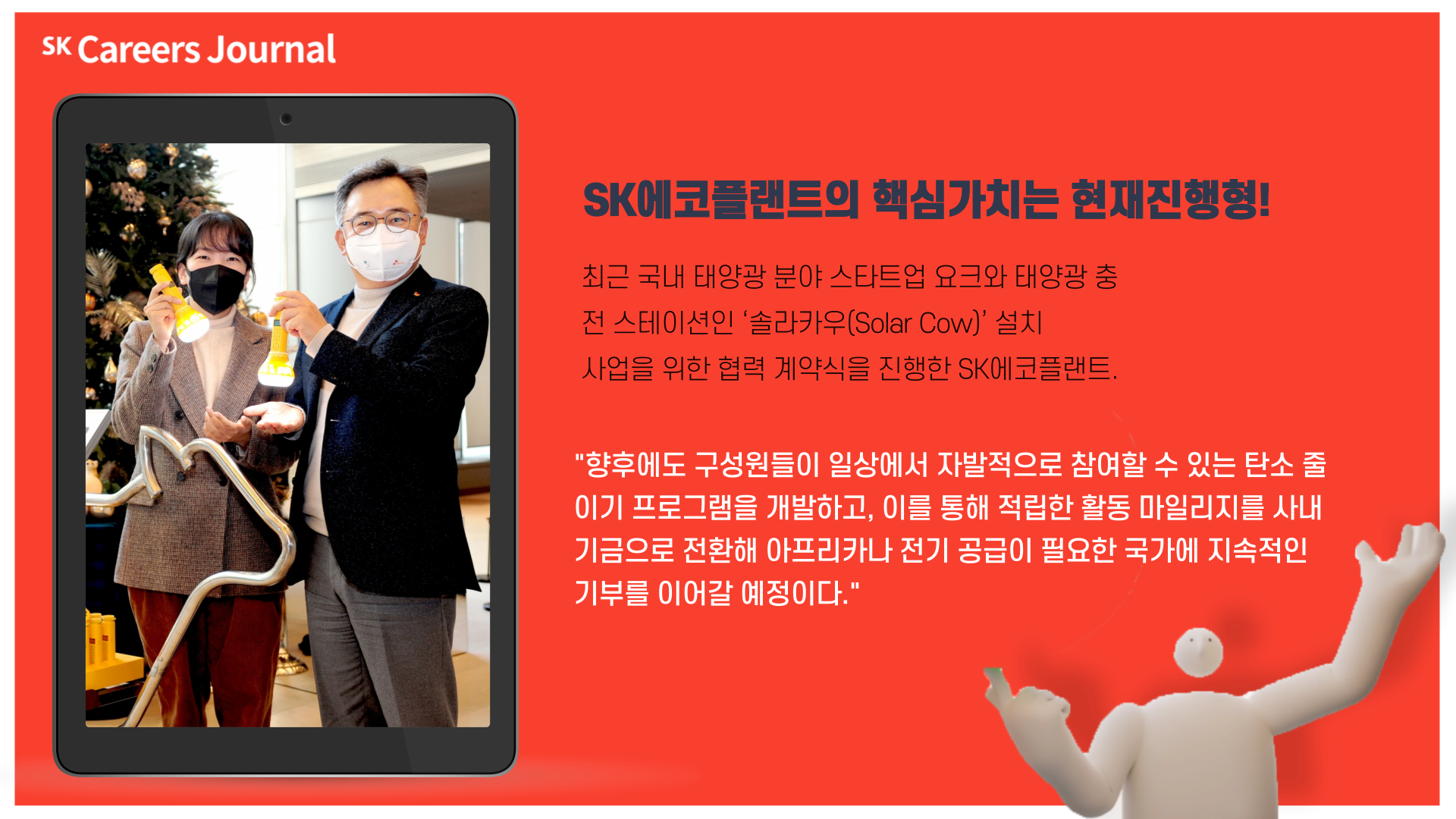 이와 더불어 윤장석 SK에코플랜트 ESG센터장님은 SK에코플랜트가 향후에도 구성원들이 일상에서 자발적으로 참여할 수 있는 탄소줄이기 프로그램을 개발하고, 이를 통해 적립한 활동 마일리지를 사내 기금으로 전환해 아프리카 및 전기 공급이 필요한 국가에 지속적인 기부를 이어갈 예정이라 말씀하셨어.