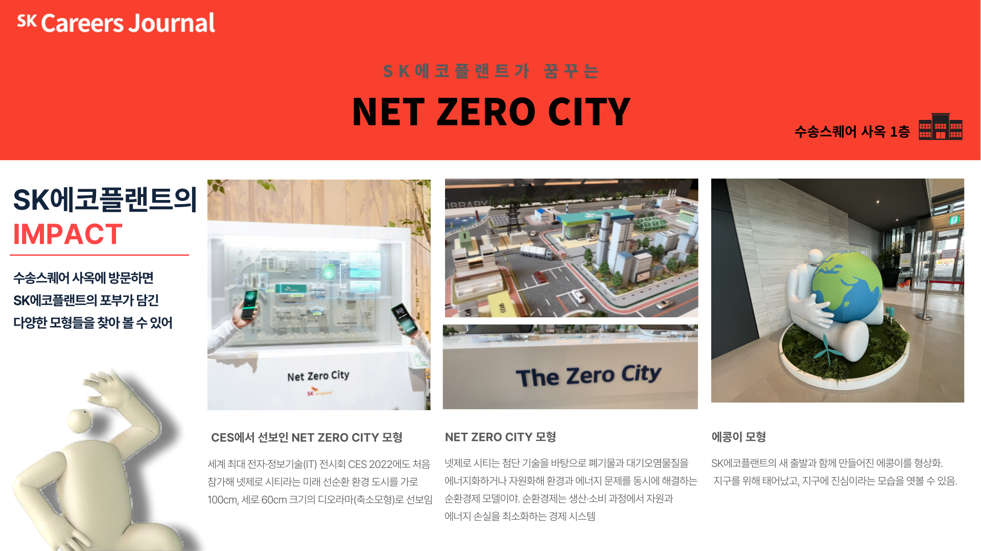 자 우선 수송스퀘어 사옥 1층에 들어가면 처음 보이는게 바로 에콩이 모형이야. 이렇게 보니 쑥쓰럽네. 지구본을 들고 있는건 SK에코플랜트의 마스코트인 내가 지구를 위해 태어났고, 지구에 진심이라는 설정을 지니고 있음을 볼 수 있어. 그리고 더 깊숙이 들어가보면 ‘넷제로 시티’ 모형을 발견할 수 있어. 넷제로 시티는 첨단 기술을 바탕으로 폐기물과 대기오염물질을 에너지화 하거나 자원화해 환경과 에너지 문제를 동시에 해결하는 순환경제 모델이야. 순환경제는 생산·소비 과정에서 자원과 에너지 손실을 최소화하는 경제 시스템이지. 예를 들어 버려지는 폐기물을 효과적으로 분리·수거해 자원으로 재사용하고, 남는 폐기물을 에너지원으로 재활용하는 것을 들 수 있어. 이와 같은 활동을 통해 자원낭비와 지구오염을 제로(Zero)로 만든다는 것이지. 이외에도 모형을 자세히 들여다보면 SK에코플랜트가 현재 진행 및 추진 중인 재생에너지 기반 그린수소 생산, 연료전지 발전, 폐기물 에너지화, 그린 리노베이션 등 환경·신재생에너지 해법을 볼 수 있어. 또한 해당 모형은 지난 1월 미국 라스베이거스에서 열리는 세계 최대 전자·정보기술(IT) 전시회 CES 2022에서 SK에코플랜트가 가로 100cm, 세로 60cm 크기의 디오라마(축소모형)로 선보여서 여러 전문가들로부터 호평을 받기도 했어.