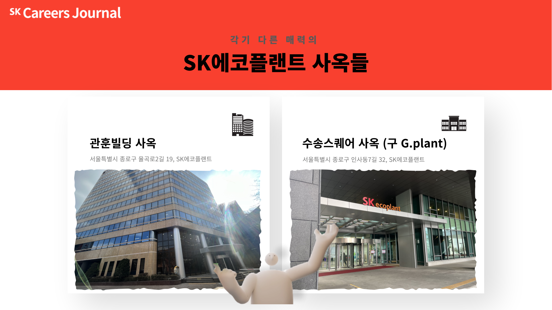 우선 이를 구체적으로 보여주기 전에 SK에코플랜트의 사옥을 소개할게. 맞아. SK에코플랜트의 사옥은 종로구 인사동에 총 2곳이 위치하고 있어. 왼쪽은 관훈빌딩 사옥이고 오른쪽은 수송스퀘어 사옥이야. 수송스퀘어 사옥은 얼마전 까지만 하더라도 ‘G.Plant’라는 명칭을 사용했지만 최근 들어 기존 명칭이었던 수송스퀘어로 다시 변경 했어.
