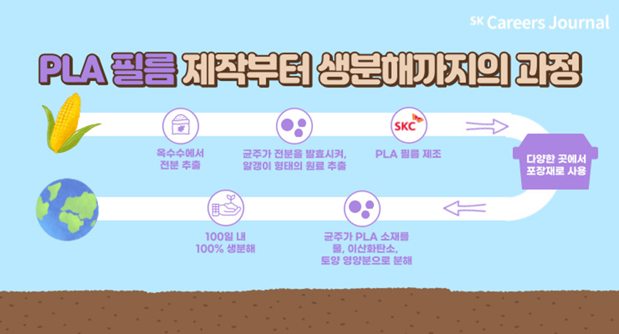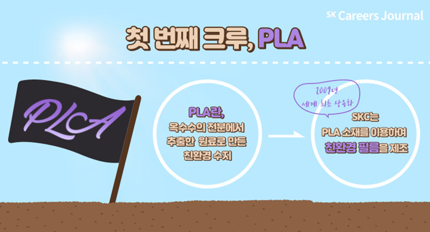 PLA는 옥수수의 전분에서 추출한 원료로 만든 친환경 수지로, 100% 자연으로 돌아갈 수 있는 생분해 소재입니다. SKC에서는 이를 이용하여 특수한 필름 제조 기술과 함께 친환경 필름을 제조합니다. PLA 필름은 식물 유래 성분으로 만들어진 특수한 친환경 필름이며, SKC가 2009년 세계 최초로 상용화하여 지금까지도 그 시장을 확대하고 있습니다.