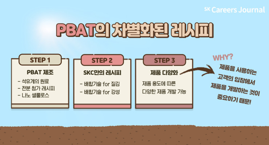 그렇다면, SKC는 왜 PBAT에 다른 소재를 배합함으로써 더 뛰어난 제품을 만드려고 할까요? 생분해 소재가 잘 보급되려면 제품을 사용하는 고객의 입장에서 제품을 개발하는 것이 중요하기 때문입니다. 제품 개발에서 멈추지 않고, 이 소재가 어떤 시장에서 어떻게 쓰일지 고민하며 나아가는 것이죠. 앞으로 더욱 많은 시장에서 더욱 발전할 PBAT 제품이 기대되네요!