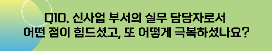 어려운 점이라기보다, 아무래도 전통적으로 디지털 헬스케어 사업을 추진해 온 회사가 아니기 때문에 실무 과정에서 크고 작은 시행착오를 겪게 됩니다. 하지만 새로운 것을 알아가고 우여곡절 끝에 목표한 사항을 성취해 나가는 기쁨이 신사업 부서의 매력 중 하나가 아닐까 싶습니다. 업무의 어려움이 있으면 낮은 자세로 해당 분야 전문가들에게 이메일로 질의를 하기도 하고, 찾아 뵙고 조언을 듣기도 하면서 숙제를 풀고자 하는 편입니다.