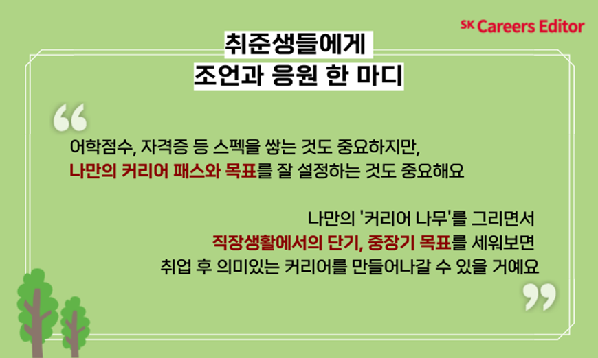 누구에게나 취업 준비는 힘들고 지치는 과정의 연속일 것입니다. 그 과정이 쉽지 않기 때문에 얻게 되는 성취도 더욱 크게 느껴지는 것 아닐까 싶습니다. 한 가지 조언을 드린다면 취업 준비 과정에서 어학 점수, 자격증과 같은 스펙을 쌓는 것도 중요하지만 한 번쯤은 나만의 커리어 패스와 목표를 잘 설정해보시라고 말씀드리겠습니다. 한 번쯤 백지에 여러 갈래로 나만의 ‘커리어 나무’를 그려 보신다면 자신이 직장생활을 통해 성취하고자 하는 단기, 중장기 목표들이 어느 정도는 보이지 않을까 생각합니다. 저 역시 취업 준비생 때 나무 그림을 그려봤었는데, 간혹 이직이나 직장 내 이동과 같은 고민을 하게 될 때 이 그림이 어느 정도의 선택 기준이 되어 주었던 기억이 납니다.