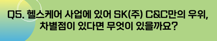 의료 도메인에 대한 전문성은 디지털 헬스케어 전문 기업에 비해 다소 부족한 면이 있지만, 이는 국내 유수의 대학병원 의료진과 여러 파트너사와의 협업을 통해 보완해 나가고 있습니다. 개인적으로는 SK(주) C&C가 여러 산업군의 고객, 파트너사와 진행했던 프로젝트를 통해 얻은 인사이트들이 헬스케어 산업에서 참신한 접근으로서 참고가 되는 경우가 많다고 생각합니다. 이런 점이 우리 회사만의 강점이라고 생각합니다.