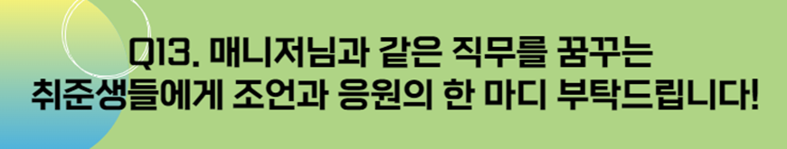 매니저님께서 마지막으로 전해주신 응원의 한 마디도 속속 기억이 나시죠?😀 취업준비의 과정이 누구에게나 힘들겠지만, 우리 모두 자신만의 커리어 패스를 꾸준히 잘 닦아 나가면서 더 좋은 기회를 잡을 수 있는 취준생이 되기를 바라봅니다. 다시 한 번 인터뷰에 응해주신 장세균 매니저님께 감사의 말씀 전합니다.
