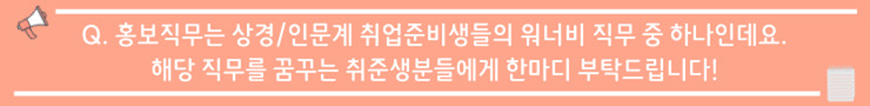추가적으로, 대화를 많이 하는 직무이다 보니, 다양한 분야에 관심을 갖고 요즘의 트렌드, 이슈에 민감한 것도 홍보직무를 수행할 때 필요한 자질 중 하나라고 생각합니다.