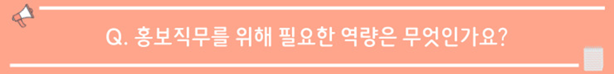 홍보직무에 필요한 역량 중 가장 기본은 바로 커뮤니케이션을 잘해야 한다는 것입니다. 내가 전달하고자 하는 메시지가 상대방에게 정확하게 인지될 수 있게끔, 잘 정제하고 정리하여 말하는 능력이 중요합니다.