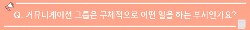 ‘Communication” 그룹이므로 커뮤니케이션을 하는 부서라고 생각하시면 됩니다. 즉, 대외적으로 우리회사가 알리고 싶은 메시지를 정확하게 알릴 수 있도록 하는 업무를 담당하고 있습니다. 우리회사의 여러 이해관계자들, 예를 들면 주주, 일반소비자, 거래처, 또는 일반 대중분들에게 우리회사가 하고싶은 이야기를 전하는 스피커이자, 다양하게 소통하는 창구 역할을 한다고 보시면 됩니다.