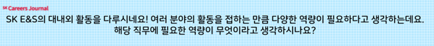 안녕하세요 SK E&S Media Comm. 팀 유재승 매니저입니다. SK E&S에 입사한 지는 올해로 5년 차가되었구요. Media Comm. 팀에 온 지는 2년 차라 아직도 일을 열심히 배우는 중입니다.