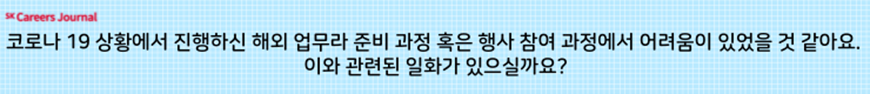 예전에 국민연금공단 지사에서 청년인턴을 했던 적이 있는데요. 매번 처음 보는 분들이지만 스스럼없이 다가가고 이야기하고 하면서 Communication 역량을 키울 수 있었던 것 같습니다. 이를 바탕으로 사내 구성원분들에게도 편안하고 유쾌한 후배/동료/선배가 되면서 사내 네트워킹도 잘 다질 수 있었던 것 같습니다.