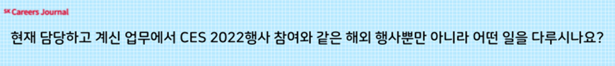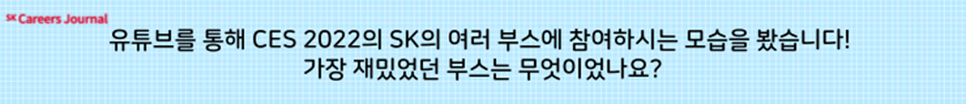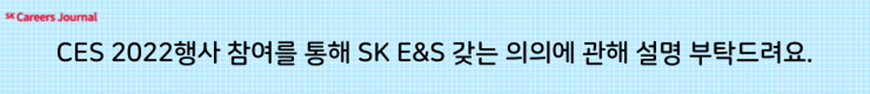 안녕하세요, SK E&S 취재기자 김지혜입니다. 오늘은 특별한 분께 CES 2022 후기를 들어보려고 하는데요! CES 2022, 들어보셨나요? CES는 미국에서 열리는 세계 최대 규모의 전자제품 박람회인데요. 이번 CES 2022에 SK E&S가 처음으로 참여했다고 합니다. 생생한 후기 들어보러 가실까요~? 😉