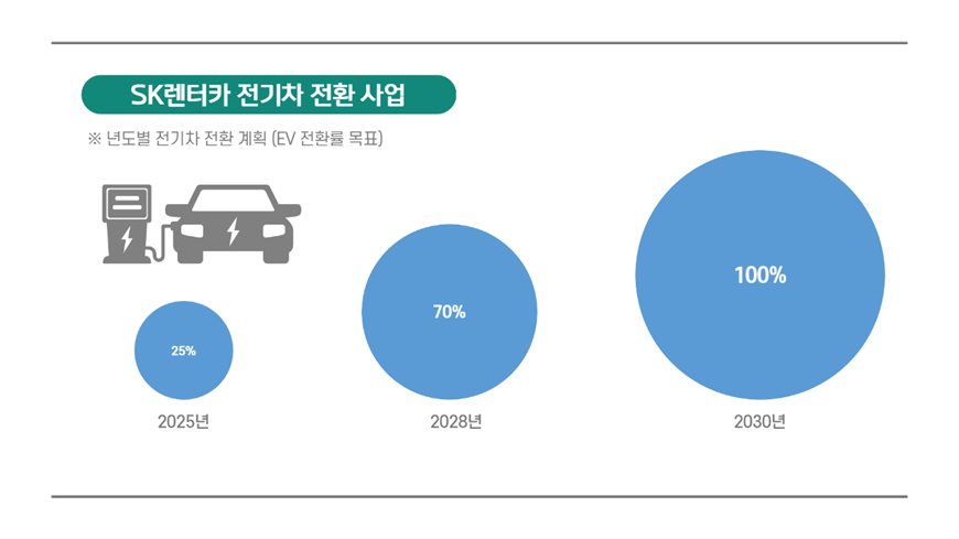 다음으로는 SK네트웍스의 모빌리티 사업과의 시너지입니다. 앞서 말한 것처럼, SK네트웍스는 Net Zero 2040을 실천하기 위해 SK렌터카, 스피드메이트와 같은 모빌리티 사업에서도 탄소 배출을 줄이기 위한 목표를 설정해 두었습니다. SK렌터카는 온실가스 감축을 목표로 전기차 전환 사업을 계획 및 진행 중에 있으며, 연도별 전기차 전환 계획을 아래와 같이 설정하였습니다.
