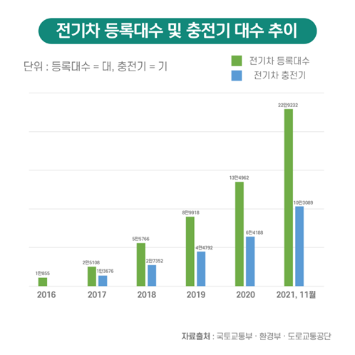 물론, 아래의 그래프를 보시다시피, 국내 전기차 충전소의 증가 추이가 마냥 느린 것만은 아닙니다. 실제로 환경부가 2021년 초에 계획하였던 전기차 충전기 공급량 목표는 최소 9만 6000기 이상 설치하는 것이었다고 하는데, 2021년을 기준으로, 전국의 공공 전기차 충전기 대수는 10만 3089기로, 연초에 설정했던 목표는 충분히 달성하였죠. 단지 사람들의 전기차 수요가 급증하였고, 그 수요를 전기차 충전기 공급량이 따라가지 못했을 뿐이었습니다.