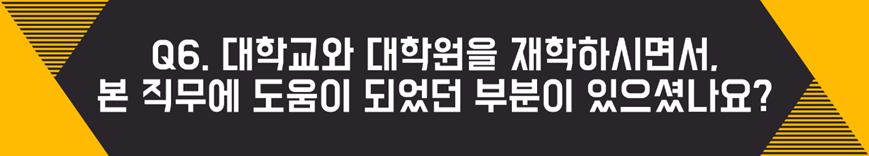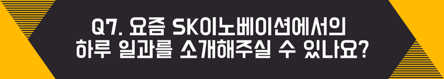 세상에 하나쯤은 도움이 되는 일을 하자는 다짐을 몸소 실천하기 위해, 학부생 때부터 끊임없이 노력하며 자기계발을 실천하고 계신 변주이PM님과의 인터뷰였습니다. PM님의 취업준비 과정부터 합격 이후의 소식까지 들을 수 있었는데요. 자신만의 가치와 목표를 마음 속에 항상 되새기며 이를 이루고자 노력한다면 그 결실을 맺는 순간이 어느 순간 꼭 찾아올 것이란 생각이 들었습니다. PM님의 따뜻한 목표가 큰 울림을 주는 순간입니다. 여러분들도 취업이라는 멋진 레이스 후에 어떤 가치를 실현하고 싶은 지 곰곰이 생각해보는 시간을 가지면 좋겠습니다! 그럼, 모두 함께 SK이노베이션에서 만나는 날을 기대하며 마무리하겠습니다. 감사합니다.