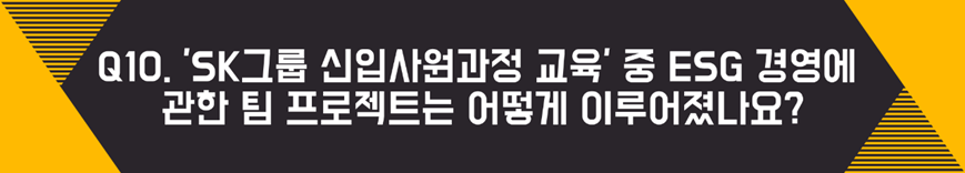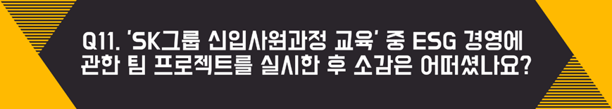 교육 과정에서 팀 프로젝트로 진행했던 ESG경영에 대한 부분이나 그린밸런스 2030 등에 관하여 진행을 하면서, 회사 차원이나 그룹 차원에서 중요하게 생각하는 방향에 대해서 함께 인지할 수 있었던 시간이었습니다. 그래서 SK의 그러한 장기적인 계획에 저도 함께 속한 일원으로서 회사가 나아가려는 방향에 어떤 도움을 줄 수 있을지 고민을 하게 되었습니다. 특히, 어떻게 하면 더 도움이 될 수 있는 직무 역할을 수행하고 맞춰서 나아갈 수 있을지 고민을 했던 것 같습니다.