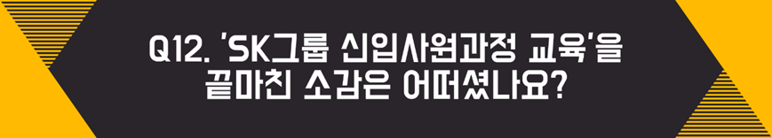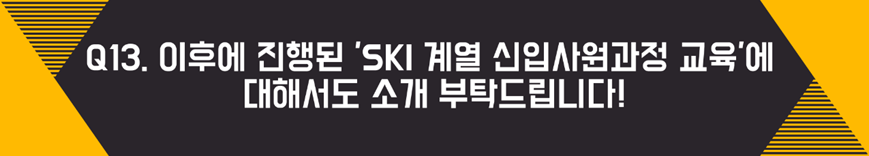 SK그룹 신입사원과정 교육이 2주간 진행되었는데, 메타버스 플랫폼을 비롯한 온라인 환경에서 진행을 하니 2주가 굉장히 빠르게 지나간 것 같았습니다. 그리고 교육을 들으면서 느꼈던 점은, 짧은 시간일지라도 SK구성원으로서 성장할 수 있게 SK의 분위기에 대해 소개를 받을 수 있었던 시간이었습니다. 또한, 교육 진행자분들을 비롯한 입사 동기들을 만나뵐 수 있었는데 다들 저희를 따뜻하게 챙겨주려고 하시는 모습이 인상 깊었던 것 같습니다. 교육을 통해서 SK라는 회사가 더 반갑고 친근히 느껴질 수 있는 계기가 되었던 것 같습니다.