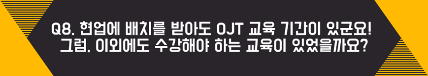 최종 합격 이후에 ‘SK그룹 교육’이 2주간, ‘SK이노베이션 계열 교육’이 1주간 이루어졌습니다. ‘SK그룹 교육’은 SK그룹 전반에 대한 이해도와 경영철학 등을 주제로 다루었다면, ‘SK이노베이션 계열 교육’에서는 SK이노베이션 계열에 초점을 맞춘 이해와 다른 PM님들과 친밀도를 쌓을 수 있는 시간이 있었습니다. 그리고 현업에 배치를 받은 후, 실무적인 이해를 도울 OJT 교육을 받습니다.
