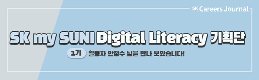 마지막으로 소개할 활동은 SK그룹 학습 플랫폼 my SUNI에서 주관하는 Digital Literacy 기획단 활동입니다. 본 활동은 최근 국내외 많은 기업에서 핵심 역량으로 주목하는 Digital 역량을 체계적으로 학습해 나가는 것을 돕는데요, 얼마 전 기획단 1기 활동이 진행 및 종료되었죠! 본 활동 소개를 위해, 얼마 전 1기 활동을 마쳐 따끈따끈한 후기를 전해주실 안정수 님을 모셔 보았습니다!
