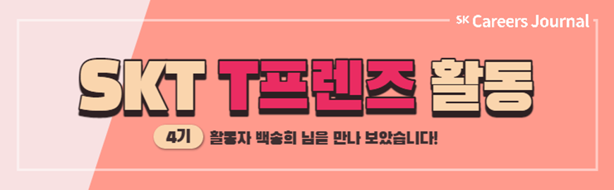 이번에 소개할 SKT T프렌즈는 SK텔레콤에서 주관하는 활동이랍니다. 포스터에서도 ‘SK텔레콤과 20대의 연결고리’라는 문구를 확인해 볼 수 있는데, 그만큼 T프렌즈는 대학생들만의 아이디어를 들을 수 있는 미션을 마련하고 있답니다. SKT T프렌즈 활동을 소개하기 위해 4기를 수료하고, 최근 5기에 다시 지원하여 연임을 하게 된 백송희 님을 모셔 보았습니다. 함께 알아볼까요?