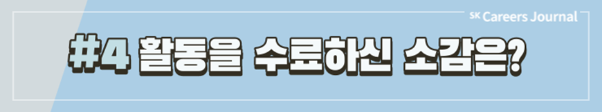 매달 2편의 기사를 기획하고 작성하는 것이 결코 쉽지만은 않았는데, 꾸준히 끝까지 수행한 스스로가 대견하기도 해요. 또 SK저널에 이름을 올릴 수 있었던 소중한 기회였다 생각해 뜻깊고, SKCE활동이 스스로의 성장점이 되었다고 생각합니다.