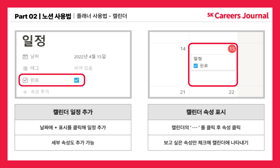 먼저 ‘캘린더’ 기능을 이용하면 그 달의 달력을 한 눈에 볼 수 있습니다. 해당 날짜에 커서를 대면 + 표시가 뜨고 이를 클릭하면 일정을 추가할 수 있습니다. 또 각 일정별로 속성을 추가해 세부사항을 적을 수도 있답니다. 속성에서 체크박스를 선택하면 완료여부를 체크할 수도 있습니다.