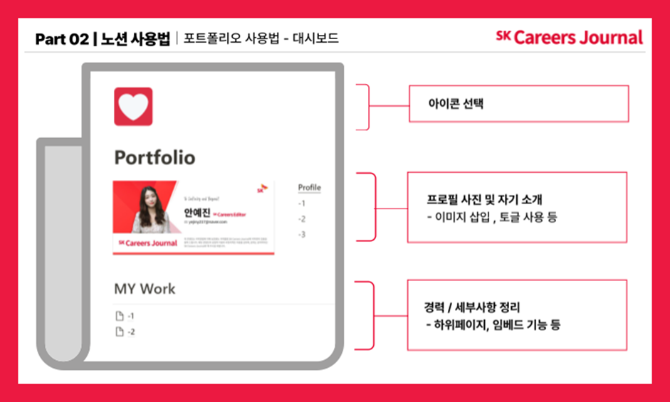 그렇다면 마지막으로, 포트폴리오로 활용하는 법에 대해 알아볼까요? 포트폴리오를 통해 나를 소개하고, 경력사항 및 역량들을 세분화하여 설명할 수 있습니다. 앞에서 사용했던 기능들을 통해서도 깔끔하게 나타낼 수 있지만, 조금 더 체계화한다면 더욱 좋겠죠? 이럴 때 사용하는 기능이 있습니다. 바로 ‘대시보드’ 만들기입니다.