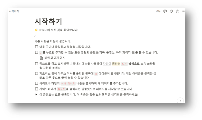 아마 가장 많이 사용할 기능은 ‘페이지’일 것입니다. 노션을 처음 열면, ‘시작하기’ 페이지가 있을 텐데요. 이 페이지에서도 대략적인 사용법을 알 수 있습니다.
