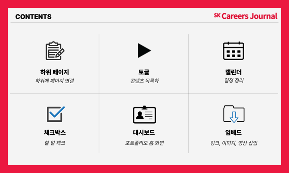 오늘은 여러 가지 기능 중에서 크게 6가지 정도의 기능을 자세히 살펴보았는데요! 바로 하위 페이지, 토글, 캘린더, 체크박스, 대시보드, 임베드 였습니다.