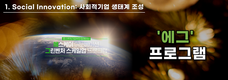 ‘에그’는 ‘에’스케이 이노베이션과 ‘그’린벤처가 함께 만든다는 의미로, SK이노베이션은 중소벤처기업부, 창업 진흥원과의 협업을 통해 ‘창업도약패키지-대기업 협업 프로그램’에 함께 합니다. 특히 SK이노베이션은 저탄소 및 배터리와 폐플라스틱의 재활용 등의 친환경 분야에 함께 참여하며 20개 스타트업의 성장 지원 방법을 적극적으로 모색하고 있답니다! SK이노베이션만의 기술력과 인프라, 투자연계 등을 통해 유망 스타트업의 성장을 지원하고, SK이노베이션 계열의 자회사들과의 협업을 통한 공동사업화의 기회를 제공하는 등 친환경 기업의 창업 생태계 조성을 위해 힘쓰고 있습니다. ESG 경영의 생태계 확장과 그린벤처 기업의 성장 동력을 이끌어내기 위해 ‘에그’ 프로그램을 함께 하고 있는 SK이노베이션! 지속 가능한 상생을 위해 노력하고 있는 SK이노베이션의 Social Innovation을 통해, 행복의 혁신에 한 발짝 더 가까워질 수 있는 것 같습니다.🥰