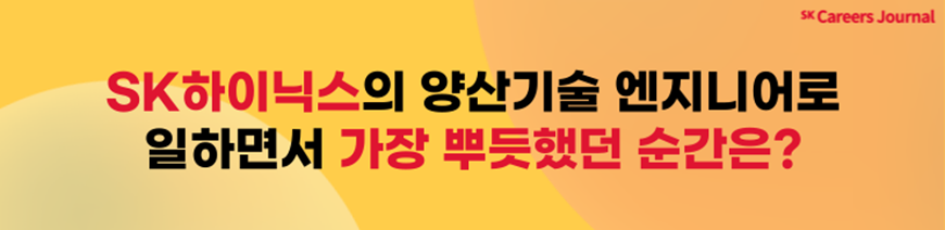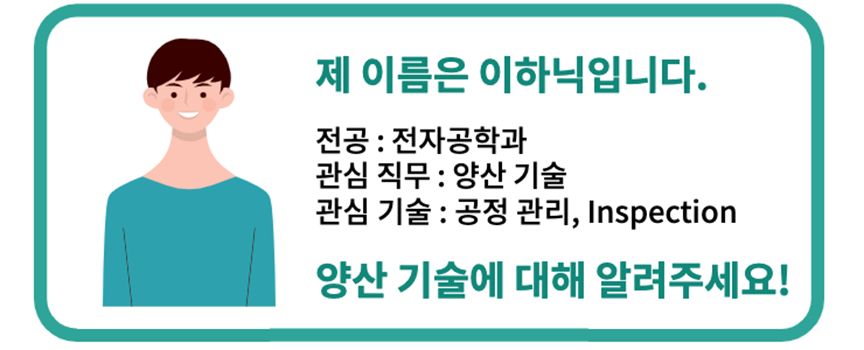 이하닉 : 안녕하세요! 저는 전자공학을 전공하고 있는 이하닉이라고 합니다. 이번 SK하이닉스 상반기 수시 채용에 지원을 했고, 평소 공정 관리에 관심이 많아 직무를 찾아보던 중 ‘양산기술’ 직무가 눈에 들어왔습니다.