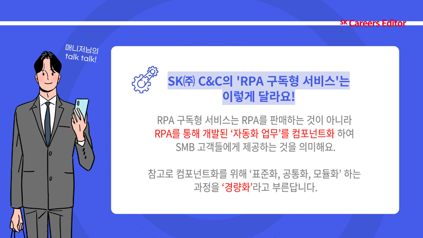 SK㈜ C&C의 ‘RPA 구독형 서비스(이하 구독형 서비스)’는 바로 이 지점에서 차별화가 됩니다. 구독형 서비스는 RPA를 판매하는 것이 아니라 RPA를 통해 개발된 ‘자동화 업무’를 컴포넌트화 하여 SMB 고객들에게 제공하는 것을 의미합니다. 그리고 자동화 업무를 컴포넌트화 하기 위해 ‘표준화, 공통화, 모듈화’ 하는 과정을 ‘경량화’라고 정의하고 있습니다.