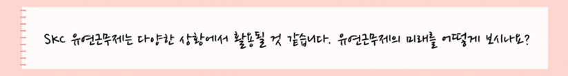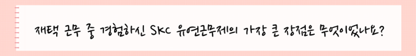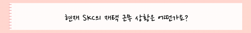 안녕하세요, SKC 취재기자 이수현입니다. 여러분은 재택근무에 대해 어떻게 생각하시나요? 이전에는 IT 업계에서만 보이던 재택근무가, 코로나 팬데믹으로 인해 우리의 일상에 성큼 다가왔습니다. 어쩌면 앞으로도 많은 기업에서 유지될 재택근무는 어떻게 진행되는지, 무슨 장점을 가지는지 궁금하지 않으신가요? 재택근무를 자세히 알아보기 위해, SKC의 유연근무제를 기획하신 문가은 매니저님을 만나보았습니다.
