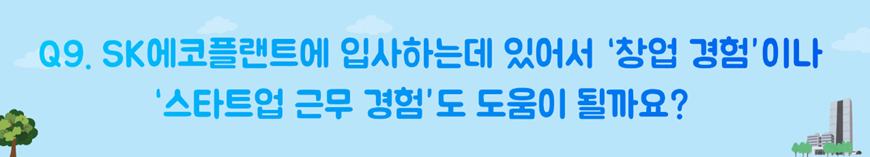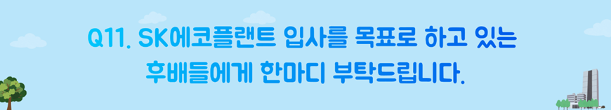 사실 최근 취업을 준비하시는 모든분들이 능력도 저희때보다 훨씬 더 출중하신걸 알고 있어요.제가 막 특별한 이야기를 해드릴 수 있는 위치는 아니겠지만 자신이 어떠한 것을 잘 할 수 있을지 명확히 인지하시고 이것을 SK에코플랜트의 방향성과 잘 맞추셔서 지원을 하시면 분명 좋은 결과가 있을거에요.