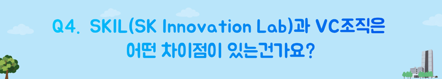 저희가 SKIL이라는 이노베이션 랩 아래 VC라는 조직으로 존재하는 것입니다. 저희는 초기부터 *Pre-Ipo까지 스타트업 선발부터 투자까지 있어 전 단계를 보는 조직이고, SKIL은 올드 인더스트리를 유의미한 미래형 사업으로 전환하는 데 필요한 과정을 이행합니다. 일종의 중간자적 역할이죠. 예컨대 저희가 스타트업의 자금 운용에 관해 솔루션을 제공하고, 그들의 자체적인 기술을 더욱 성장시킬 수 있도록 도우며, 사업이 원활하게 진행될 수 있도록 공간을 제공하는 것 모두 이와 같은 역할에서 비롯된 활동들이죠.