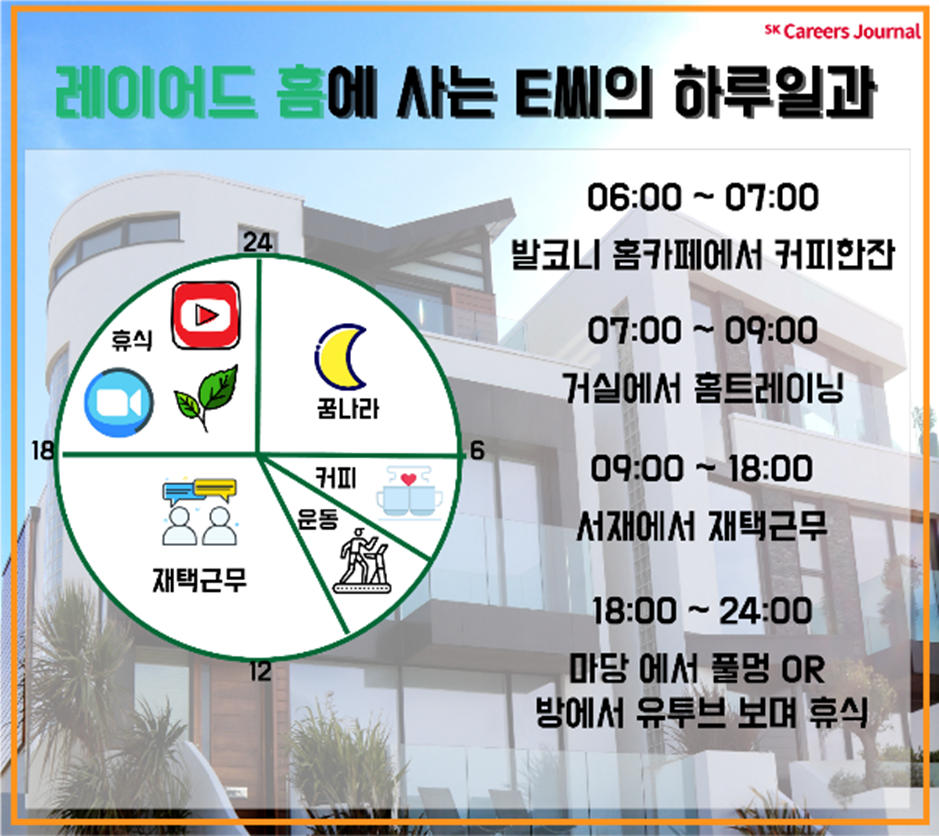 안녕하세요. 여러분~! 최근 코로나 확산세로 인해서 집에서 머무는 시간이 늘었 났는데요. 이런 상황에서 지내는 20대 중반의 S 씨의 일상을 들어보았습니다. S 씨는 오전 8시에 기상을 하여 1시간 동안 홈트레이닝을 한 후 9시부터 6시까지 재택근무를 합니다. 근무가 끝나고 친구들과 줌(Zoom)으로 화상 술자리를 갖거나 유튜브, SK 블로그 등을 보며 시간을 보낸다고 하네요. 집에서 필요한 식료품은 주말에 집 지하에 있는 마트를 방문하여서 산다고 합니다. 또한, 자투리 시간 동안 발코니에 마련한 식물을 가꾸며 풀멍을 한다고 합니다. 이런 일상 남의 일상 같지 않으시죠?