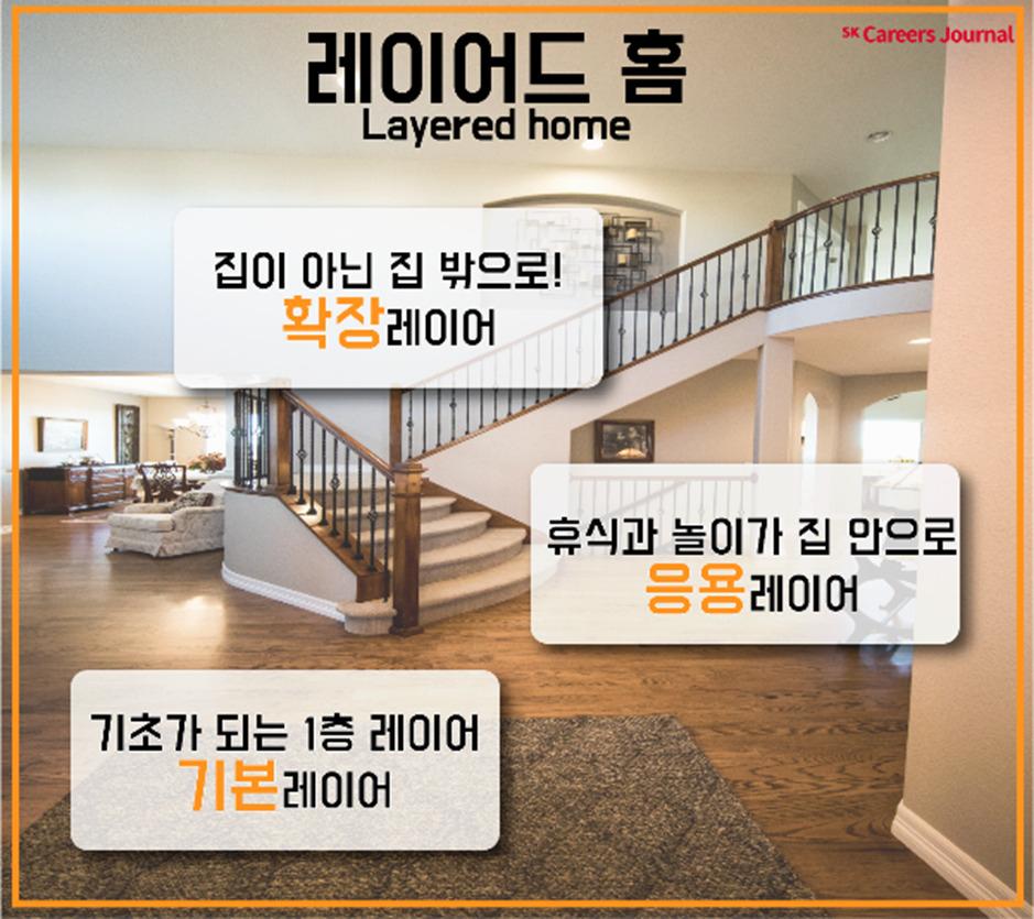 레이어드 홈은 총 3가지 레이어를 통하여서 집의 다양한 변화의 양상을 보여줍니다. 평소 우리가 알던 기능들을 강조한 ‘기본 레이어’, 집 밖에서 수행하던 여가나 놀이가 집 안으로 들어오는 ‘응용 레이어’, 마지막으로 집 근처에서 동네로 확장되는 ‘확장 레이어’로 3가지의 레이어로 나눠집니다. 이를 통하여서 집이 곧 일상이 되고 집에 대한 소비자들의 소비와 투자가 증가한다고 하니 앞으로 소비 트렌드의 일종으로 자리를 잡을 것을 예고하고 있습니다.