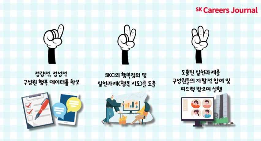 SKC 행복추진팀의 행복한 기업문화를 위한 많은 노력이, 기업 내 행복의 중요성을 말해주는 것 같습니다. 눈에 보이지 않는 행복이지만, 그 행복을 만들기 위해 체계적인 노력이 필요함이 느껴집니다. 이러한 노력 덕분에 계속해서 성장할 SKC의 기업문화가 더욱 기대됩니다!