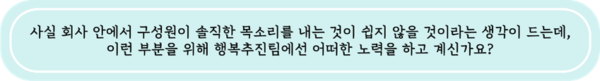 이처럼 사장님께서 구성원의 행복에 대해 관심이 아주 많으셔서 구성원들의 Real Voice 청취를 통해 행복을 저해하는 요소를 근본적으로 바꾸기 위한 많은 노력을 하고 있습니다.