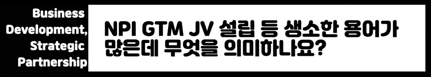 NPI는 뉴 프로덕트 인트로덕션(New product introduction)의 약어이고, GTM Plan이란 고-투-마켓 플랜(Go-to-market plan)의 약어입니다. JV는 조인트 벤처(Joint venture)의 약어로, 합작회사를 의미합니다.