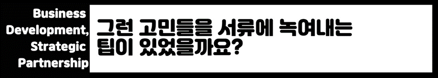종종 개인적으로 후배들의 자기소개서를 첨삭해 주면서 느끼는 건, 대부분의 모범생같이 잘 쓴 자소서들도 여전히 무미건조하고 글쓴이가 어떤 사람인지 인상이 머리에 떠오르지 않는다는 점이에요. 수천 개의 다른 서류에 섞이면 아무런 차이가 드러나지 않는, 그냥 잘 살아온 취준생의 서류가 되고 마는 거죠. 그래서 저는 어떤 자기소개서 문항이든, 본인만의 색깔, 시각이 조금 더 또렷하게 담길 수 있는 논리나 의견을 담는 것을 추천하고 싶어요. 특히나 사업 개발 쪽이라면 분석이나 진단도 중요하지만 자신만의 대안과 전략적인 판단이 있어야 한다고 생각을 하거든요. 그게 담겨 있어야 면접에서 이 사람이 대체 왜 이렇게 생각했는지 궁금증을 유발할 수 있고, 우리 조직이나 회사에 필요한 목소리를 낼 수 있는 사람이라는 걸 판단할 수 있거든요.