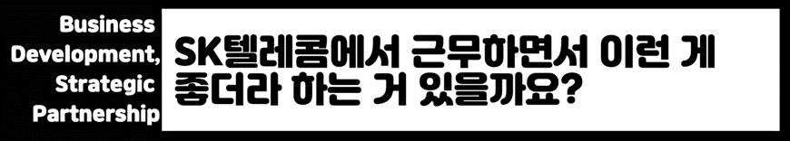 이처럼 저희 팀은 특정한 산업/사업 영역에 국한되지 않고, SK텔레콤 및 관계사가 가진 폭넓은 리소스를 활용해 글로벌 기업들과 시너지를 낼 수 있는 기회를 탐색하는 것이 주된 역할입니다.