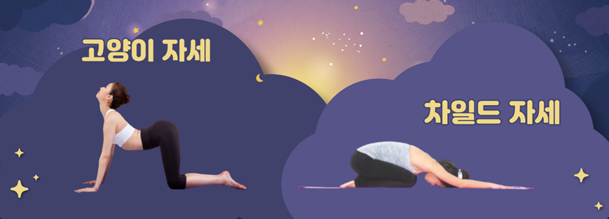 고양이 자세는, 바닥에 무릎을 꿇고 다리를 어깨너비만큼 벌리는 자세로 시작합니다. 무릎은 곧바로 엉덩이 아래에 있도록 합니다. 즉, 상체와 다리의 각을 90도로 만들고, 어깨 바로 아래에 손목이 놓일 수 있도록 양손으로 바닥을 짚습니다. 이때 발등과 발가락이 완전히 바닥에 닿게 한 후 척추를 평평하게 유지합니다. 이 상태에서 복부에 힘을 준 상태로 숨을 내쉬면서, 등과 허리가 위로 향하는 둥근 아치형을 만들어줍니다. 숨을 들이쉬면서, 다시 허리를 내려 척추를 늘려주면서 아래로 향한 아치형을 만들어줍니다. 간단하게 따라할 수 있는 고양이 자세는, 허리의 뭉친 근육을 풀어줄 뿐만 아니라 복부를 자극하고 순환을 촉진시켜 소화 불량 개선에도 도움이 된답니다!