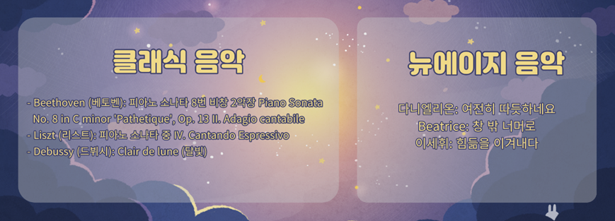 미국의 국립수면재단인 슬립파운데이션(sleepfoundation)에 의하면, 잠에 들었을 때 경험하는 생물학적 변화는 음악을 들을 때 경험하는 변화와 유사하다고 합니다! 즉, 속도가 느리고 잔잔한 음악을 듣는다면, 잠을 잘 때처럼 심장 박동수와 호흡의 속도가 느려지고 근육이 이완되는 과정이 나타난다는 것입니다. 동시에 세로토닌, 옥시토닌과 같이 심신 안정에 도움을 주어 수면을 취하기에 좋은 호르몬이 나옵니다. 그렇기에 잠이 오지 않는 밤, 음악을 통해 도움을 받을 수 있는 것이죠! 그렇다면 자기 전에 듣기 좋은 음악을 추천해드리겠습니다!