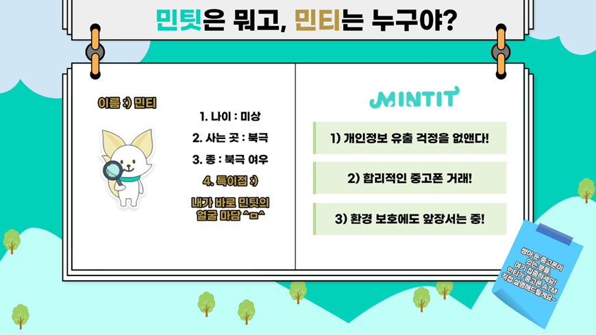새로운 스마트폰이 출시되었는데 돈이 모자라서 기기변경을 못하는 당신! 방에 쌓아둔 중고폰은 산떠미인데 개인정보 유출이 두려워 방치하고 있는 당신! 그런 여러분께 소개합니다. 바로 민팃의 중고폰 ATM! 중고거래의 번거로움도, 불합리한 가격 책정도, 그리고 개인정보 유출도 걱정할 필요 없는 이것, 오늘은 이 중고폰 ATM과 이 사업을 진행하는 기업, 민팃에 대해 민팃의 대표 캐릭터, 저 북극여우 민티가 직접 소개해드리려고 합니다! 그럼 우선, 민팃의 이야기부터 차근차근 시작해볼까요?