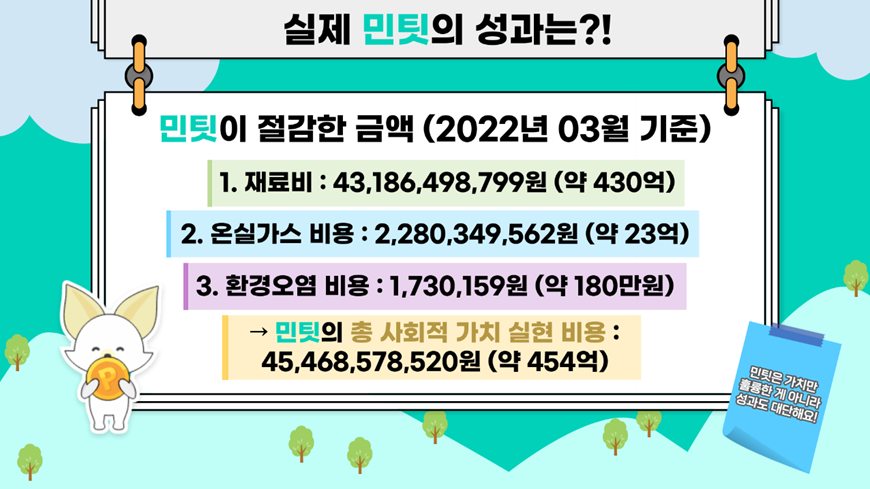 실제로 민팃은 2022년 3월을 기준으로, 재료비는 약 430억, 온실가스 비용은 약 23억, 이에 환경오염 비용까지 합한 총 사회적 가치 실현 비용을 약 454억 정도 창출하였는데요. 454억이면 치킨이 몇 마리고 국밥이 몇 그릇이더라? 아무튼, 상상하기도 어려울 만큼 대단한 성과를 내고 있다는 뜻이죠!
