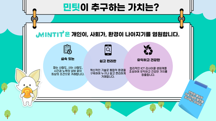 개인정보 보호, 소외계층에 대한 지원, 환경보호 등, 지속가능한 발전을 위해 존재하는 브랜드, 민팃! 앞으로도 응원해주시고, 직접 중고 스마트폰 거래에 참여해주시길 바라요. 그렇게 저 북극여우 민티의 터전도 보호해주신다면 너무 기쁠 것 같네요!