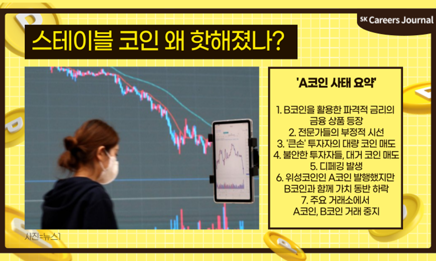 하루도 빠짐없이 주요 언론과 매스컴에서 언급되고 있는 스테이블 코인. 일명 ‘A코인 사태’로 인해 화제와 논란의 중심이 된 것인데요. ‘대충 심각한 사건인 건 알겠는데, 구체적으로는 잘 모르겠네…’라고 생각하셨던 분들을 위해 이번 사건에 대해 간단히 요약해 드릴게요!