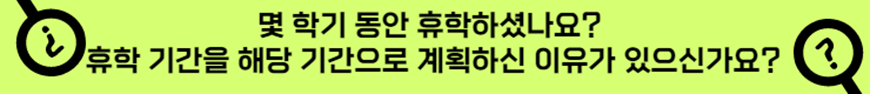 저는 우선 1년 휴학을 계획했었고요. 가장 큰 이유는 학교에서 2학년 2학기 재학생에게 주어지는 해외 대학 현지 학기 이수 때문인데요. 이를 위해 1년 휴학을 결심했었습니다. 제가 다양한 학교 밖 활동을 계획하다 보니까 거기에 한 학기는 부족하다는 생각이 들었어요. 그래서 1년으로 길게 잡았던 것 같습니다.